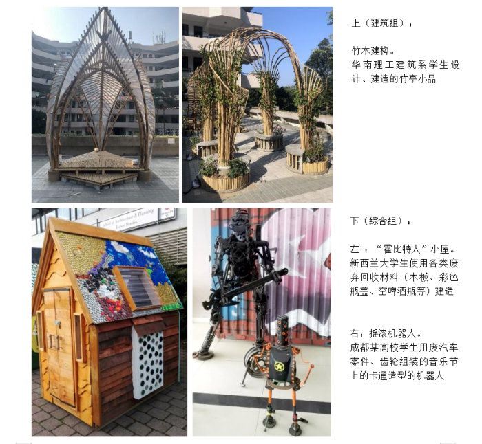| 使用材料不限。但鼓励使用以下两类材料,并提倡变废为宝的创意设计,倡导绿色可持续的建造理念。 1、环境可再生材料,如木、竹等 2、废弃回收再利用材料,如托盘、水果筐、饮料瓶等等