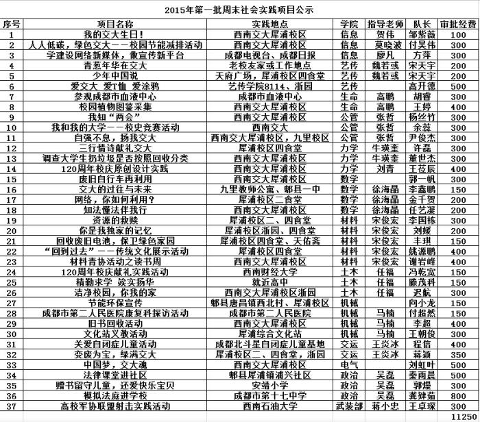 2015年4-5月批次周末社会实践自开通申报以来,共收到各学院项目75余份,经校团委审核,现有如下37支项目通过审批。周末社会实践审批原则如下:1、鼓励3-8人组成实践分队,开展与专业相关的社会实践;2、传统类型的社会实践(如去敬老院、福利院等)请在主题团日活动或“交通公益”项目中申报;3、班会、班级出游、参观风景名胜不在审批之列;4、活动无项目说明,仅提交表格过于简单的申请不在审批之列。5、同一学院已经获奖或已举办过的活动不再重复审批。请同学们周知,如对公示结果有异议, 请于2015年4月8日-4月11日向校团委601办公室郑源(电话66367148)反映,公示期间不接受匿名反映。