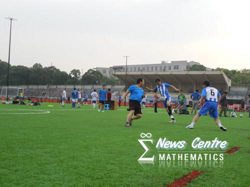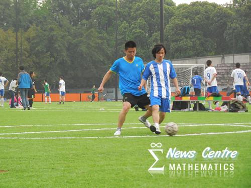 经过短暂的休息,下半场比赛正式开始。在上半场不利的情形下,数学学院的老师们开始发起猛烈的进攻以削弱对方的气势,其中不乏几次漂亮的传球和射门,然而对方却节奏合理,不紧不慢的尽力化解,赛场气氛紧张,比赛一度进入僵持状态。在场的所有观众的心都提了起来,就连平时十分稳重的领导们也开始为球员们呐喊助威,听到加油声的双方队员们顿时精神百倍,比赛进入白热化阶段。时间总是过得很快,就在球员们激烈对峙的时候,比赛结束的哨声响了起来,尽管数学学院的老师们在下半场比赛中竭力进攻,但仍与胜利失之交臂。