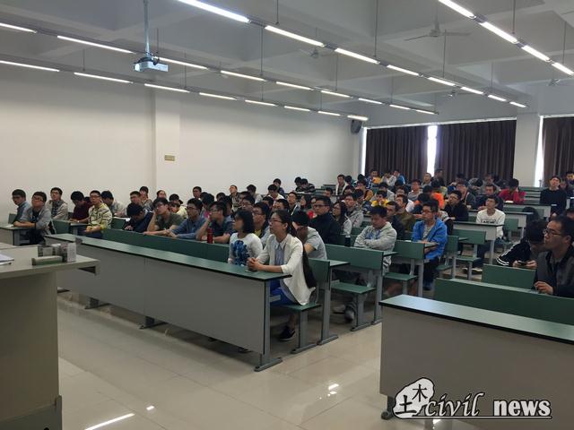 在一片热烈的掌声中,蒋老师开始了讲解。他主要从“土木行业的前景分析”和“学生择业分析”两个方面对学生存在的包括目前的就业前景及行业的就业面等困惑进行解答。他认为土木行业在我国属于朝阳产业,有着良好的发展前景。在今后的发展中,住房需求将稳中有升而目前城市地下空间开发热潮兴起,高速发展的国情下行业存在很大的发展空间。另一方面,蒋老师又将施工、设计、监理及创业等几个职业发展方向的优势与不足详细列出,并以真实的例子进行讲述,进一步加深了在场学生的感受。最后,蒋老师也希望同学们放平心态,注重个人能力与经验的积累,积极面对走向职场后的挑战,完成自我的梦想。