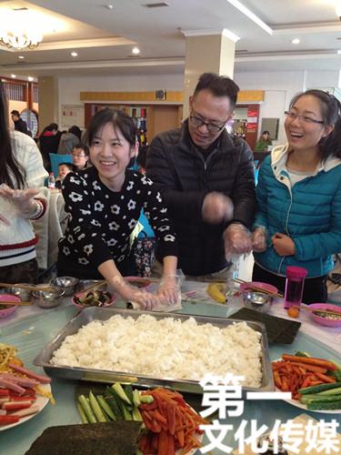 在主持人的引导下,“忘年会”来到了紧张有趣的日本知识问答竞赛环节,同学们积极参与,比赛精彩纷呈。随后开始了大家最期待的寿司制作和品尝美食环节。神钢公司的嘉宾、日语系老师们纷纷参与到同学们中去,与大家一起开始亲手制作寿司。轻松的氛围、愉快的交流、精致的美食以及活跃的气氛,使得现场笑声不断、热闹非凡。担任本次忘年会美食“大厨”的吕兆新博士、王菲副教授、曾建老师、陈动英老师、王欢老师和承办班级2013级日语2班的同学们还为大家准备了可口的水饺和地道的日式味增汤,让大家大饱口福。最后的现场抽奖环节再次将活动推向了高潮。
