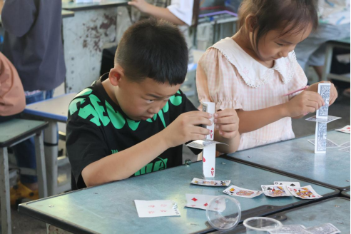 小学员搭建纸牌建筑
