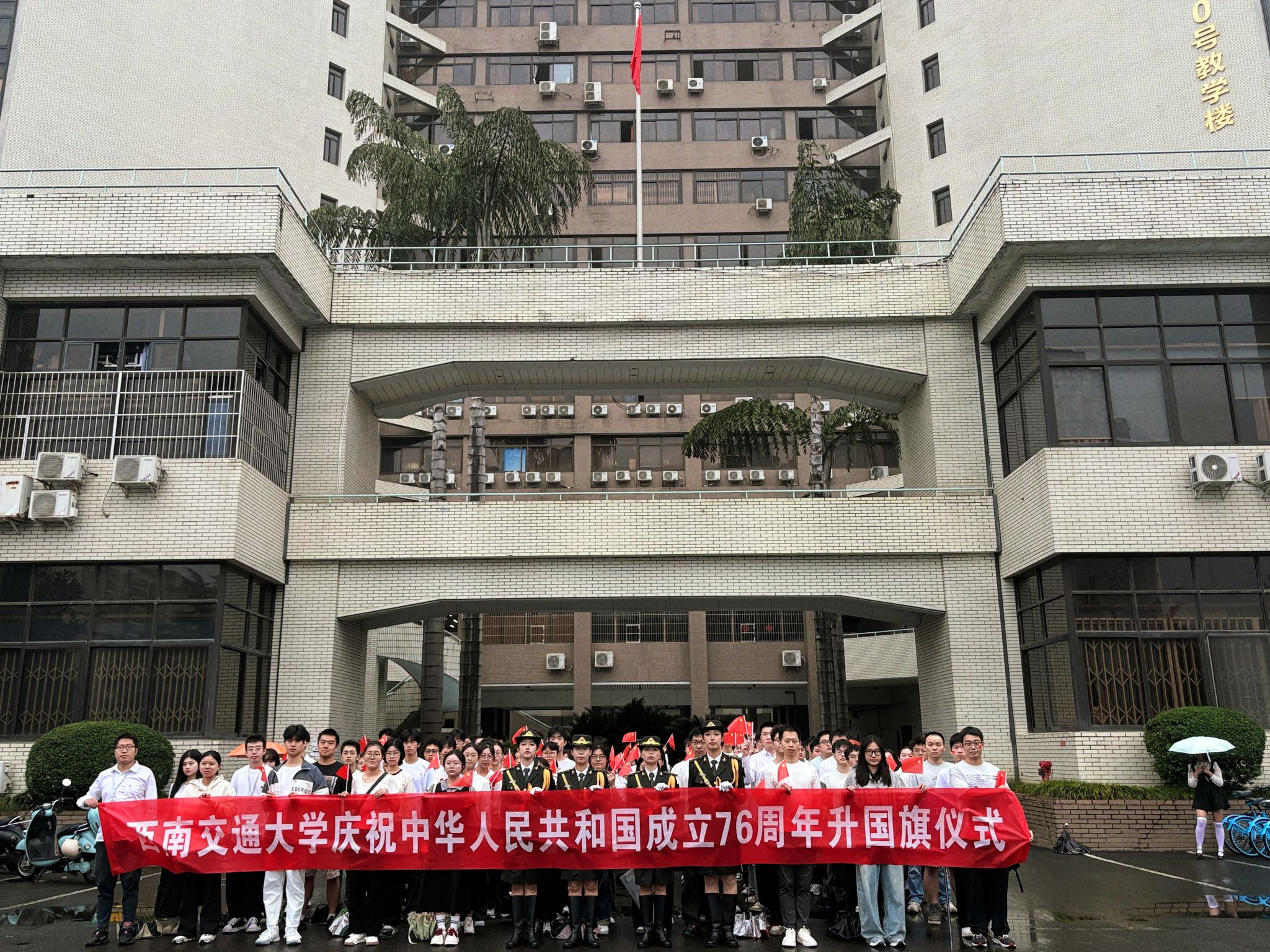 为热烈庆祝中华人民共和国成立76周年,深入学习贯彻习近平总书记在纪念中国人民抗日战争暨世界反法西斯战争胜利80周年重要讲话精神,进一步加强新时代爱国主义教育,激发广大师生的爱党爱国爱校热情,10月1日上午8:30,学校在犀浦校区东门国旗台和九里校区南门0号教学楼国旗台同步举行升国旗仪式。机械工程学院党委副书记沙晓雪、团委书记何蕊芯与青年教师代表到场,共同见证了这一庄严时刻。