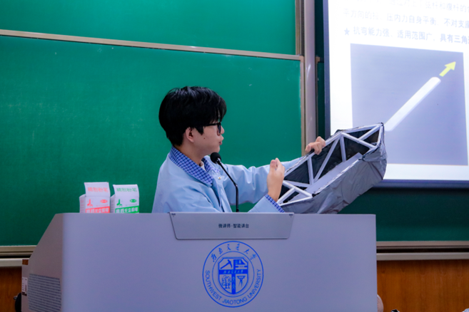 在主持人介绍完赛题基本情况后,答疑会正式开始。首先进行的是第一环节,张森同学进行赛题讲解:各参赛选手了解到命题背景为船只结构的创新设计,且需利用标准白卡纸进行模型制作。现场通过实物展示的方式对范例模型进行了说明,着重展示了其结构构型和基本外观。本次竞赛旨在让2025级土木新生能够结合土木工程专业特色,培养其创新思维和动手能力,科创中心结构组组长吕忠同学为同学们进行了深度演示,并依次解答了参赛选手特别关心的参赛作品原材料给定、作品要求、理论方案和模型收取等问题。
