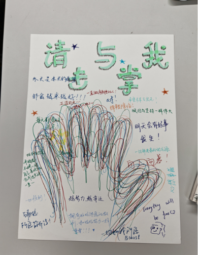 “请与我击掌”环节则将自我鼓励与群体联结巧妙融合。一张印有“请与我击掌”的硬卡纸在活动室内传递,同学们在纸上重叠绘制手掌轮廓,并写下专属心愿与鼓励话语——“一直做有韧性的人”、“每天都要变好一点”、“越努力越幸运”等字句饱含力量,“种”出了一棵满溢温暖的“手掌树”,成为同学们自我认同与彼此支持的生动见证。