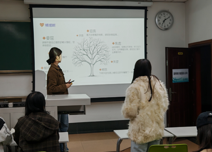 “共创情绪树”环节成为同学们自我抒发的重要窗口。小小的“情绪树”上标注着开心、焦虑、委屈、沮丧等多种情绪,工 作人员以“击鼓传花”形式邀请6位同学分享个人情绪故事:有人提到刚结束组会的疲惫奔波,有人传递即将迎来周末假期的轻松愉悦,有人分享学习任务的应接不暇……真挚的分享让在场同学产生强烈共鸣,也学会以更开放的心态接纳自身情绪。