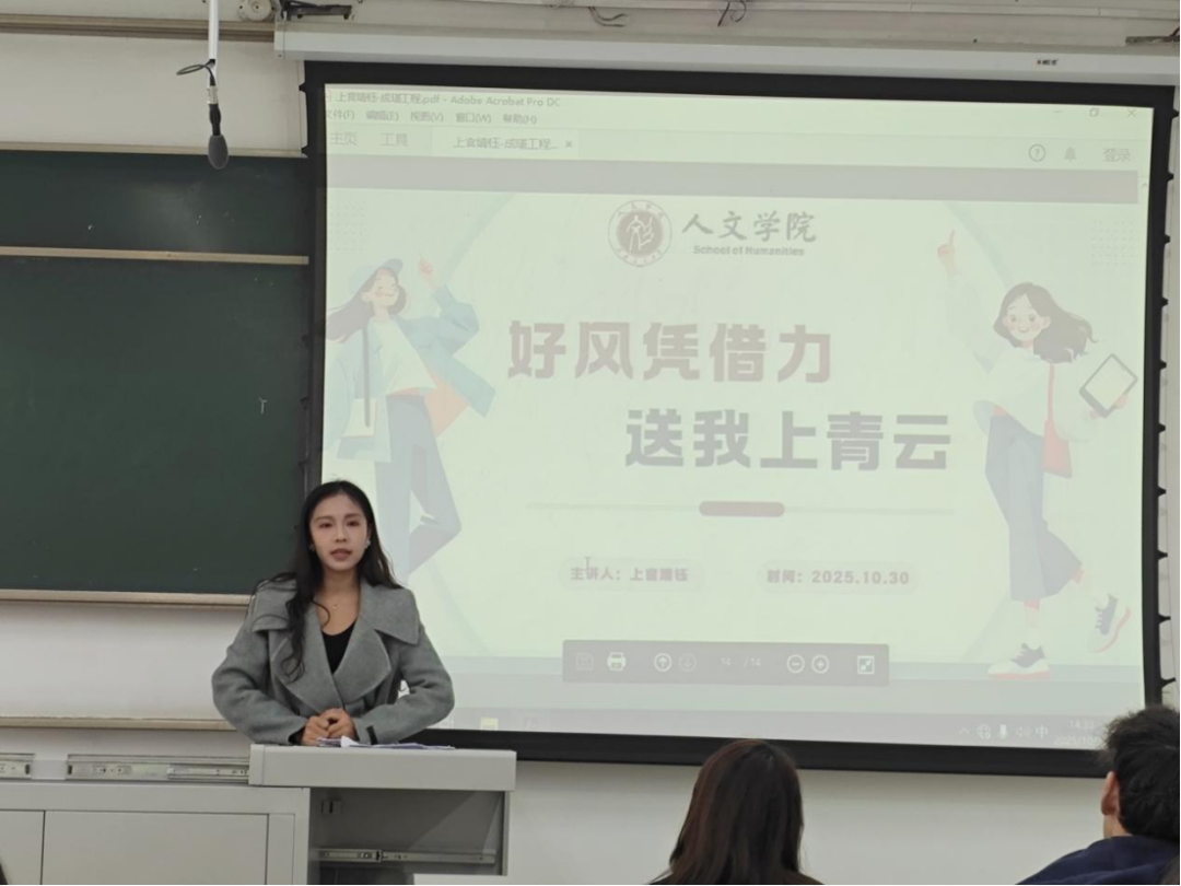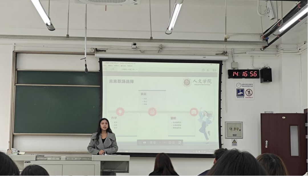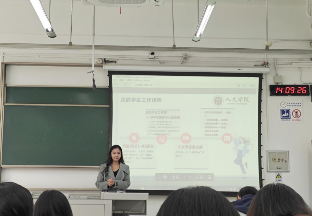 下午2时,在X2223教室举行的“从学生工作到未来职场”培训会上,人文学院辅导员上官婧钰老师以独特的互动方式开场,邀请同学们在纸条上写下有关学生工作、面临困难等问题的回答。随后,她结合自身丰富经历,生动阐述了如何将学生工作中培养的组织协调能力、团队合作精神等转化为未来职场的核心竞争力。在回应“工作与学习如何平衡”这一普遍困惑时,老师明确了“学习优先于工作”的原则,帮助学生树立了正确的学业观。