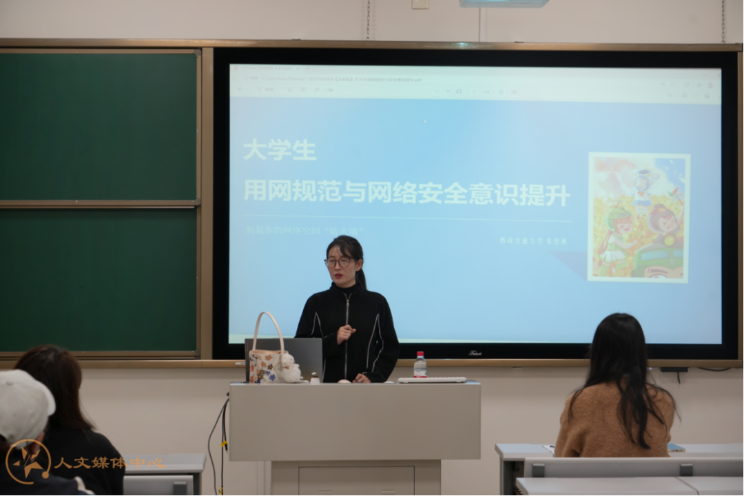 同日晚7时30分,在X30616教室,党委宣传部新媒体中心主任朱莹燕老师主讲了“数字时代的清醒者——青年网络素养提升与底线践行指南”培训。讲座围绕“大学生网络使用现状与行为特性分析、直播乱象聚焦与规范引导、网络发声准则与风险规避、网络安全意识强化与实践指引”四个板块展开。朱老师首先通过播放反映当前网络环境的视频,直观引发学生深思;随后深入剖析直播领域存在的问题,强调要坚守法律底线,自觉抵制低俗内容,做“清朗网络”空间的践行者。她特别指出,在人人皆有“麦克风”的时代,青年必须具备辨别信息真伪的能力,在网络发声时坚持“立足事实”、“拒绝诽谤”、“保护隐私”的原则,做到理性表达。