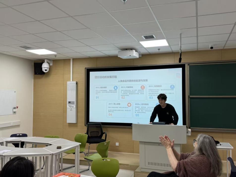 首先,团支部书记张旭和通过"人类命运共同体理念演进时间轴"PPT,系统阐释了该理念从中国倡议到国际共识的发展历程。他指出电子信息技术不应是隔绝的壁垒而应是连接的桥梁,为同学们明确了专业报国的时代内涵。