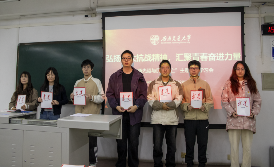 本科2022级交运詹班团支部与本科2022级交运茅班团支部联合所在党支部,共同开展“弘扬伟大抗战精神,汇聚青春奋进力量”主题教育活动,构建“党员带团员、携手共成长”的育人机制。活动设置赠书启学、精神解读、榜样链接、互动交流等环节:指导老师为学生代表赠送《求是》杂志,强化理论引导;通过邓玉芬、杨靖宇等英雄事迹,深入阐释抗战精神的四大内涵;特别结合詹天佑“自主筑路”、茅以升“架桥报国”的先驱故事,以及《大国工匠》纪录片案例,使抗战精神与交通人精神、新时代工匠精神交相辉映。党员、团员共同探讨“天下兴亡、匹夫有责”的时代意义,党员分享实践体会,团员畅谈成长规划,形成了党建带团建、团建促党建的良好氛围,有效拓展了思想政治教育的广度与深度。