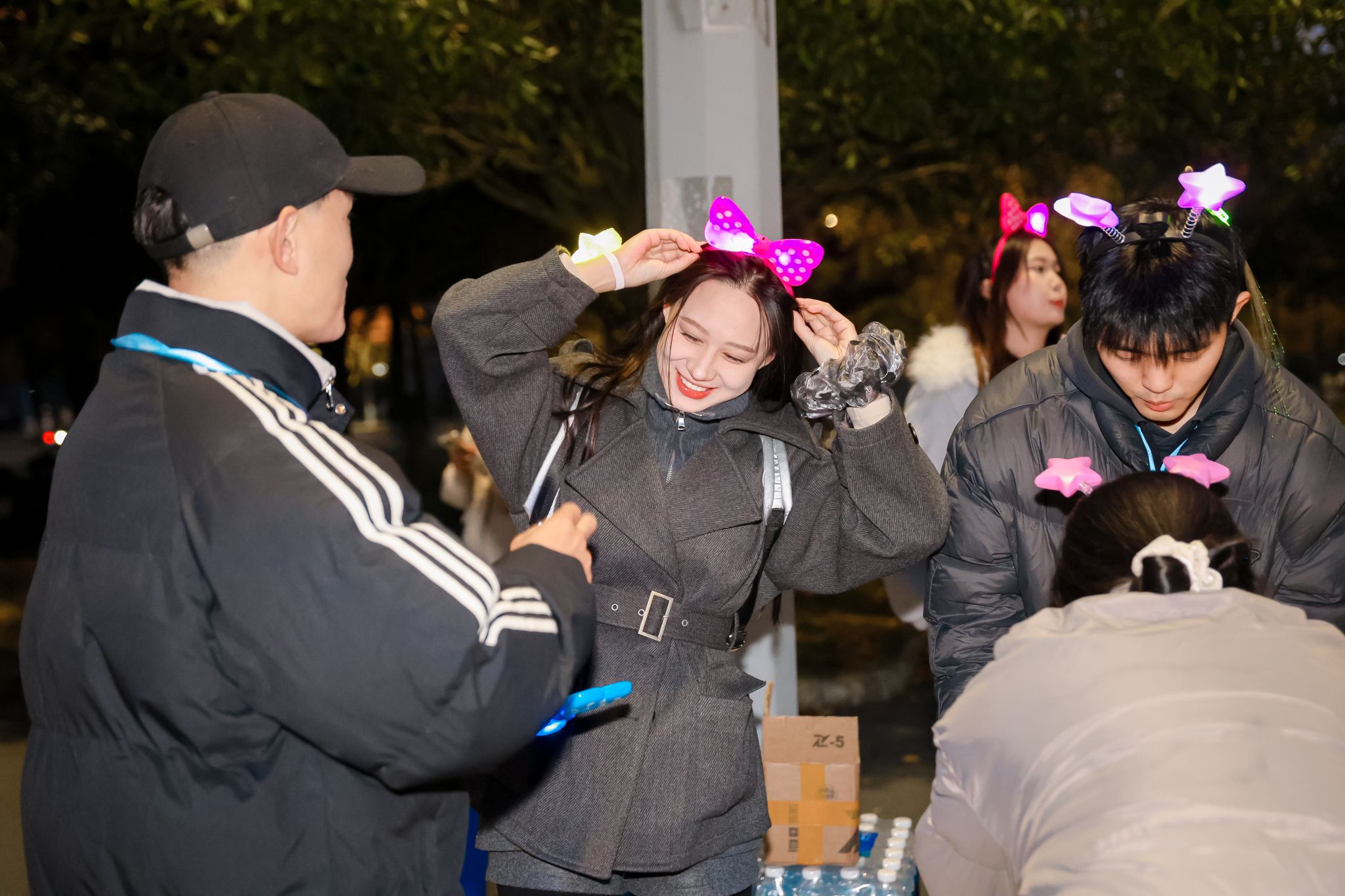 活动伊始,同学们有序领取荧光手环和头箍等氛围物品,互相拍照打卡,留下夜色中最灿烂的笑脸时刻。点点荧光于夜色中交相辉映,逐渐连成一片璀璨星河。在主持人简短热场后,领舞师生带领全场进行热身,轻松动感的节奏瞬间点燃了现场气氛,拉近了彼此的距离。