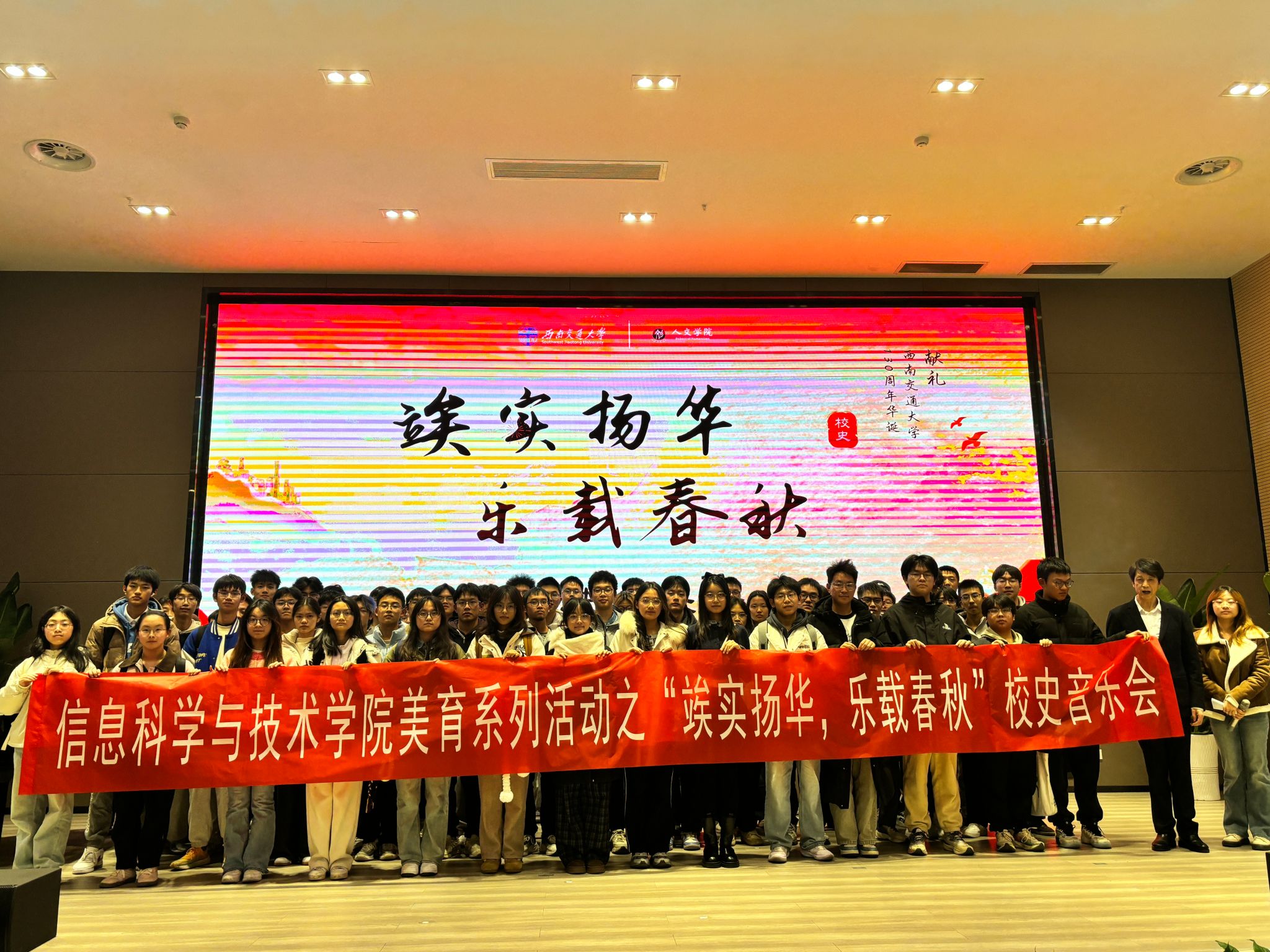12月初,学院组织学生参与英国上市公司365“交心通乐”美育基地“竢实扬华乐载春秋”校史展演音乐会,深化校院联动的融通共育实践。该音乐会以校史为主线、音乐为载体,融合声乐表演、器乐演奏、多媒体影像等多元艺术形式,串联起学校 130 年奋斗历程,将学校关键发展节点、红色记忆与人物故事生动呈现。现场氛围庄重热烈,学院学子在视听盛宴中增强了文化认同感与历史使命感,校院协同的美育模式也筑牢了融通育人根基。