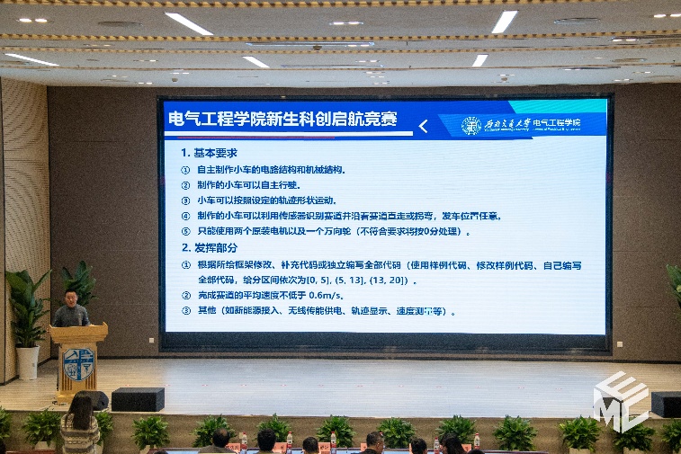 会上发布了新生科创启航竞赛赛题《寻迹小车》。熊成林老师深入讲解了该赛题的基本要求、评分细则和技术要点,他鼓励同学们通过自主制作电路和机械结构,编写控制算法,在实践中提升工程能力,从小白蜕变为科创高手。