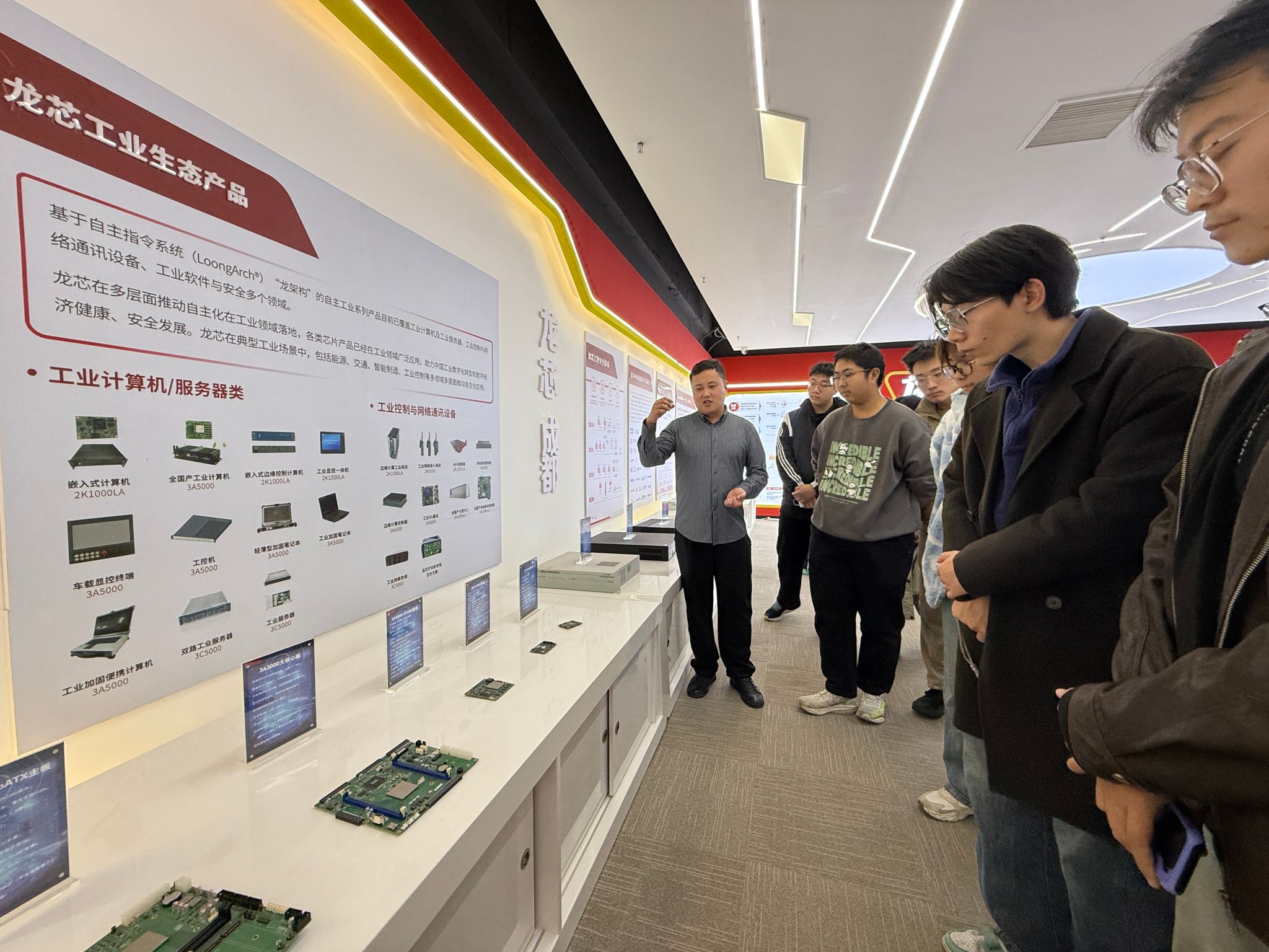 下午14时30分,师生一行前往龙芯中科(成都)技术有限公司实地参访。在企业嵌入式生态平台总监张书玮的讲解下,师生深入了解公司在自主指令系统研发、核心芯片设计领域的系列技术突破。展台前,师生驻足观摩,对其基于自主架构、达到国际主流水平的性能表现赞叹不已,更对“关键核心技术是要不来、买不来、讨不来的”这一论断有了更为切身的体悟。