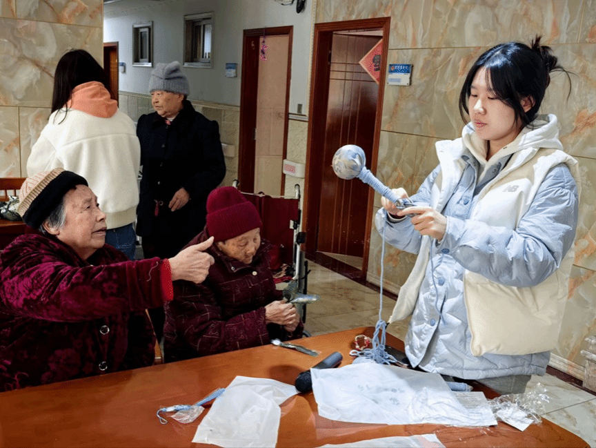 第二场活动以传统艾锤养生为主题展开。实践队采用“理论讲解+动手实践”的模式,向老人们普及了艾锤温经通络、驱寒除湿的养生作用,并全程陪伴、协助老人们亲手制作艾锤。穿绳、固定、装饰,每一个步骤都饱含心意,老人们在动手实践中不仅学会了实用的日常养生方法,更收获了一份凝聚着青春关怀的专属养生工具。