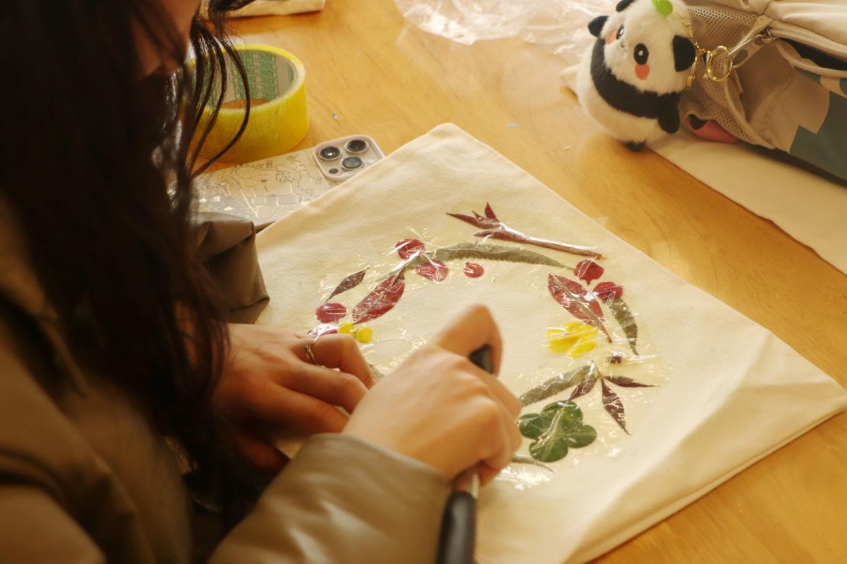 此次活动特别设置自由创作环节,鼓励同学们漫步校园收集植物。不少同学反馈,锤拓时那专注的敲击声与植物的香气相互交融,营造出强烈的沉浸感,极大缓解了学业压力。“拓印时仿佛时间变慢了,每一锤下去都能感受到内心的平静。”一名参与者分享着自己的感受。心理学相关研究表明,手工创作与自然接触的结合具有情绪疗愈作用。这场活动通过艺术与自然的双重疗愈,为校园心理健康教育提供了创新路径。当创意火花在锤拓声中迸发,设计学子正以艺术之名,探索着人与自然的双向治愈之道。