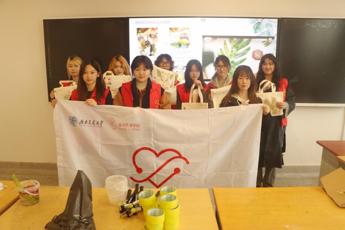 活动现场特设植物艺术工坊,志愿者们将精心收集的羊蹄甲、樱花等校园植物铺陈于丝质衬布,宛如展开一幅春日水彩画卷。在志愿者们的指导下,同学们手持特制拓印锤,以轻重交错的节奏叩击植物纤维,许多同学主动探索二次创作,将采集的银杏叶、诸葛菜与抽象几何图形结合,编织出独属春日的生态叙事。"这些稍纵即逝的脆弱生命,此刻在布料上获得了永恒。"一位手持鸢尾花拓印作品的同学动容地说。当暮色为作品镀上金边,百余件布袋艺术装置在展厅摇曳生姿,既是对自然之美的礼赞,更是设计学子将生态意识转化为艺术语言的创新实践。