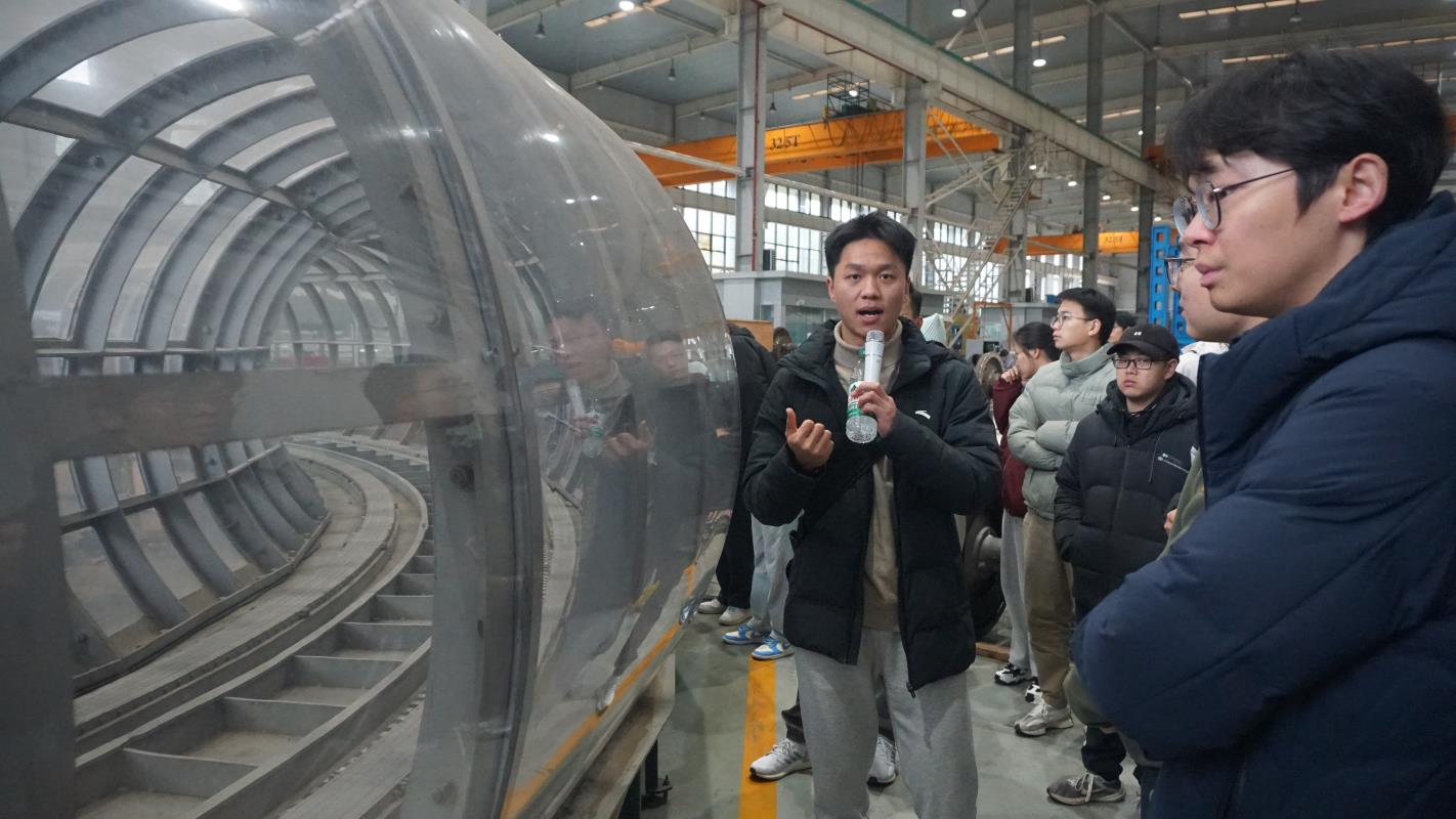 在活动过程中,大家对高温超导磁悬浮环形试验线表现出极大的兴趣,一边认真聆听,一边积极地与赵伯毅讲解员交流问题。最后同学们依次参观了高温超导磁悬浮环形试验线模型车,亲身感受高温超导磁悬浮的非凡魅力。