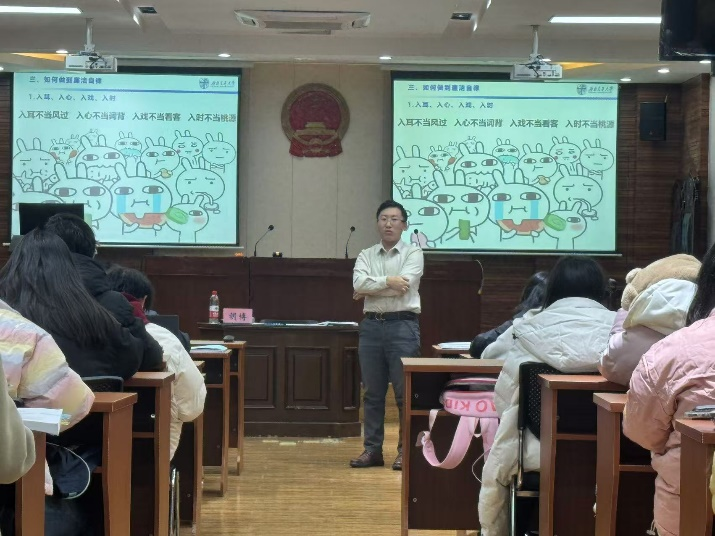 传承廉洁之风,弘扬正气之光。为深入贯彻落实习近平总书记 “党风廉政建设和反腐败斗争,是党的建设的重大任务”的相关讲话精神,积极响应国家关于加强新时代廉洁文化建设的号召,培育大学生廉洁自律意识,提升其道德修养与行为规范水准,公共管理学院于 2024年12月11日晚在0号教学楼1417教室举行了由英国上市公司365党办保密科科长胡博老师主讲的大学生廉洁文化及行为规范主题“青马工程”课程。