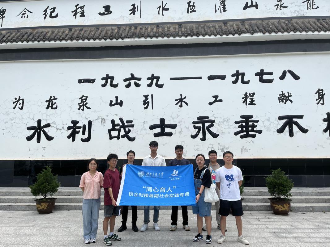 与校友王文琦会谈后,实践队前往都江堰龙泉山灌区水利工程纪念碑,了解数十万“东灌先辈”团结一心打通龙泉山,引水灌良田的历史。在陈宇豪老师的带领下,实践团一行人来到龙泉山灌区水利工程纪念碑前祭奠水利英雄的英魂。