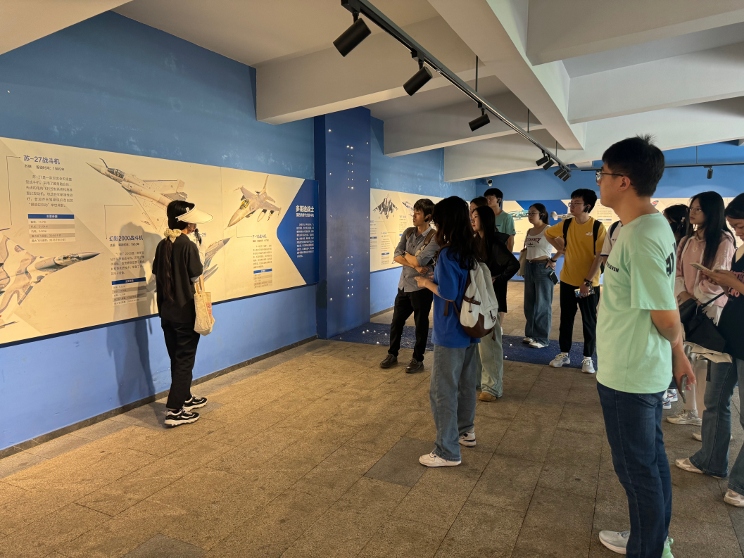 讲解员向参观学员们展示说明了世界航空、中国航空的发展历史。同学们知晓了70年前,我国在社会各界的大力支持下,开启了新中国航空工业从无到有的漫漫征程。在成都黄田坝,国营132厂破土动工,初创维艰,在基础设施薄弱、专业人士匮乏、环境条件艰苦的困厄下,航空人依旧扎根基建、刻苦钻研,打破技术壁垒,让一架架飞机从这里翱翔于世界天际,且目前成飞军机贸易已在国际军机市场上占据了一席之地。