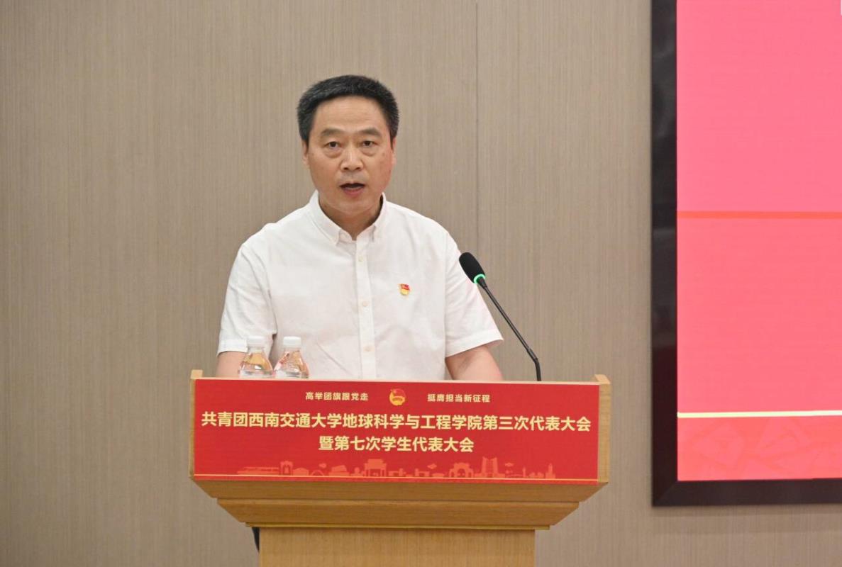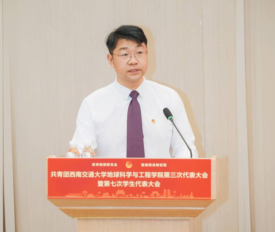 地学学院党委书记关秦川代表学院党委向大会的召开表示热烈的祝贺,向多年来一直关心和支持学院共青团工作、莅临本次大会的各位领导、老师以及各位青年朋友们表示热烈的欢迎和衷心的感谢,向参会的各位团学代表致以亲切的问候与美好的祝愿。他指出,过去五年,学院团委踔厉奋发,在思想政治引领、基层组织建设、推动青年发展、服务青年成长、深化团学改革、凝练品牌项目、助力大国工程等方面做了大量卓有成效的工作,取得了广泛的影响。他代表学院党委对学院团委和广大团员青年提出三点希望:一是听党话、跟党走,在坚定理想信念的道路上砥砺前行;二是沉下心、俯下身,在团结服务青年的一线中汲取力量;三是重实绩、出实效,在服务改革发展的大局中勇担使命。