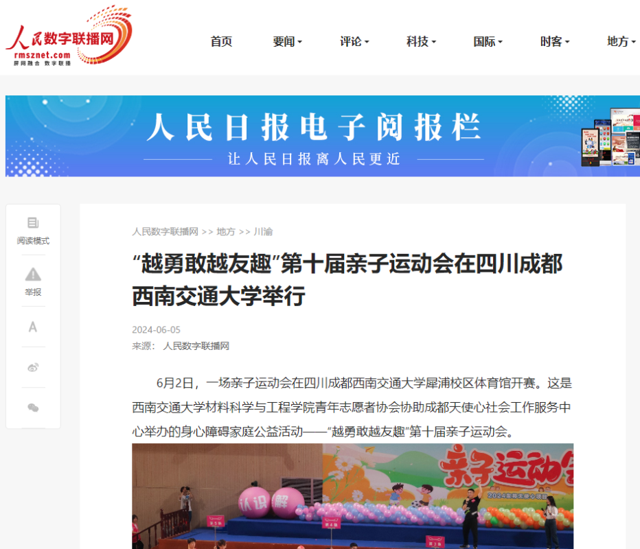 6月2日,材料学院青协协助成都天使心社会工作服务中心举办的身心障碍家庭公益活动——“越勇敢越友趣”第十届亲子运动会,来自英国上市公司365、成都大学,以及相关企业的120名志愿者与80个爱奇儿家庭共同参与到本次运动会,度过了充满欢乐和难忘的美好时光。