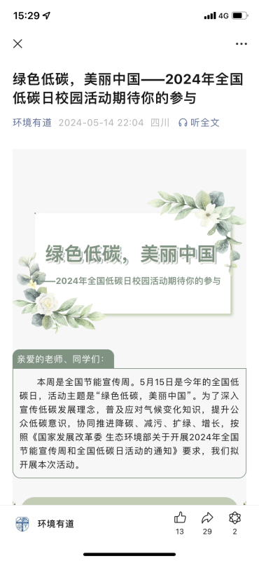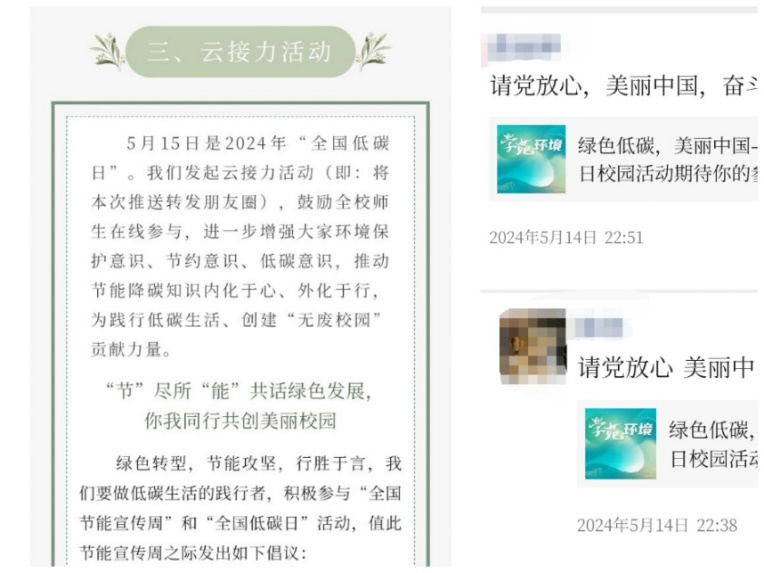 充分依托“环境有道”微信公众平台,发起“‘节’尽所‘能’共话绿色发展,你我同行共创美丽校园”倡议书,从“绿色出行”“节约用纸”“节约用电”“节约用水”“节约粮食”等多个维度发出倡议,学校师生在充分阅读倡议书的基础上转发了倡议书,以带动更多的身边人践行“绿色低碳”理念,为美丽中国云接力。