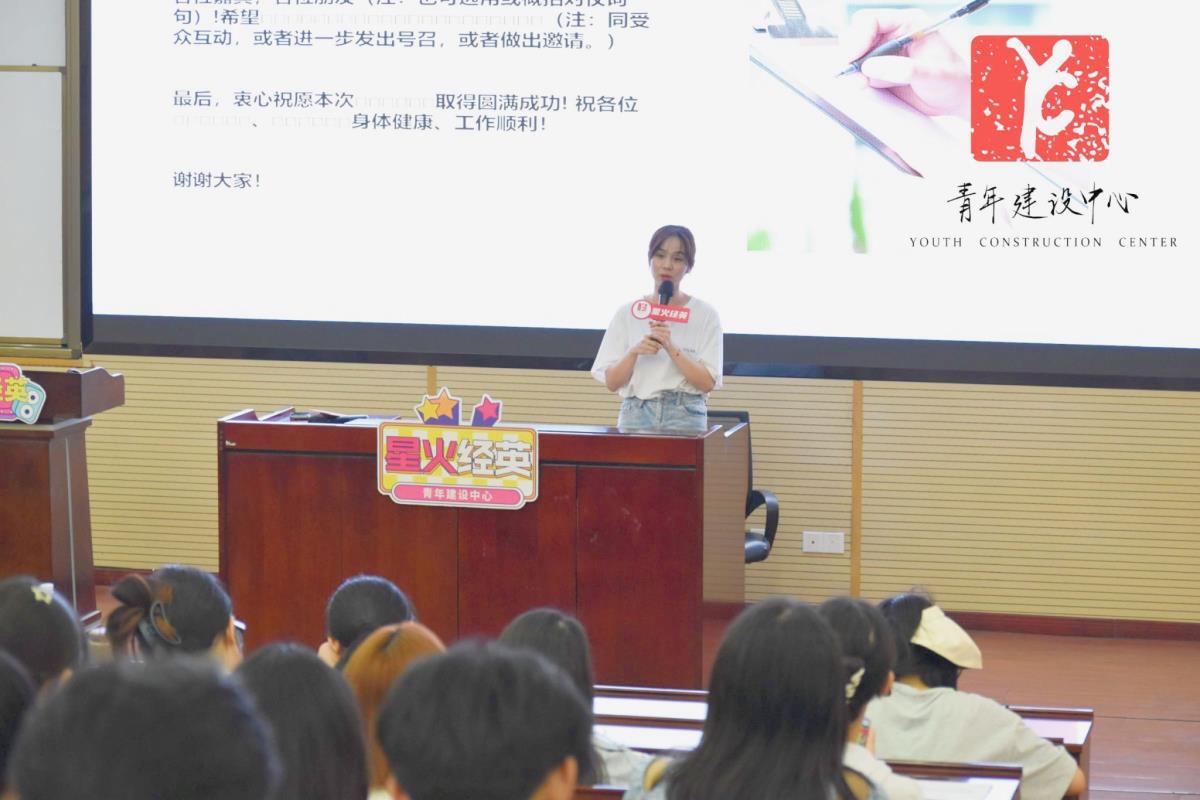 2024年5月23日晚,“星火经英”计划第一期第八次团干部培训于J0202顺利开展,本次培训由本科2021级辅导员、青年建设中心指导老师钟文婷主讲,主题为“笔杆子养成之致辞稿撰写”,旨在讲解致辞稿的写作技巧,丰富团干部们的写作知识储备。