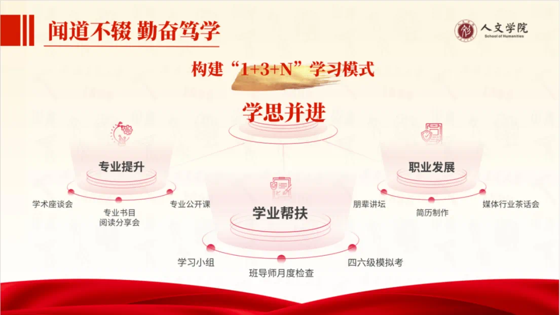 支部闻道不辍,勤奋笃学,形成支部“1+3+N”学习模式,以支部学思并进为中心,聚焦学业帮扶、专业提升、职业发展3大板块,开展四六级模拟考、专业书目阅读、朋辈讲坛等N类主题活动,形成支部“比学赶帮超”的学习氛围。支部成员课程通过率达100%,四级通过率100%,六级通过率81%,其中,四六级超过510分总人数超20人。支部成员在“互联网+”、大英赛等各类竞赛中斩获各级奖项。
