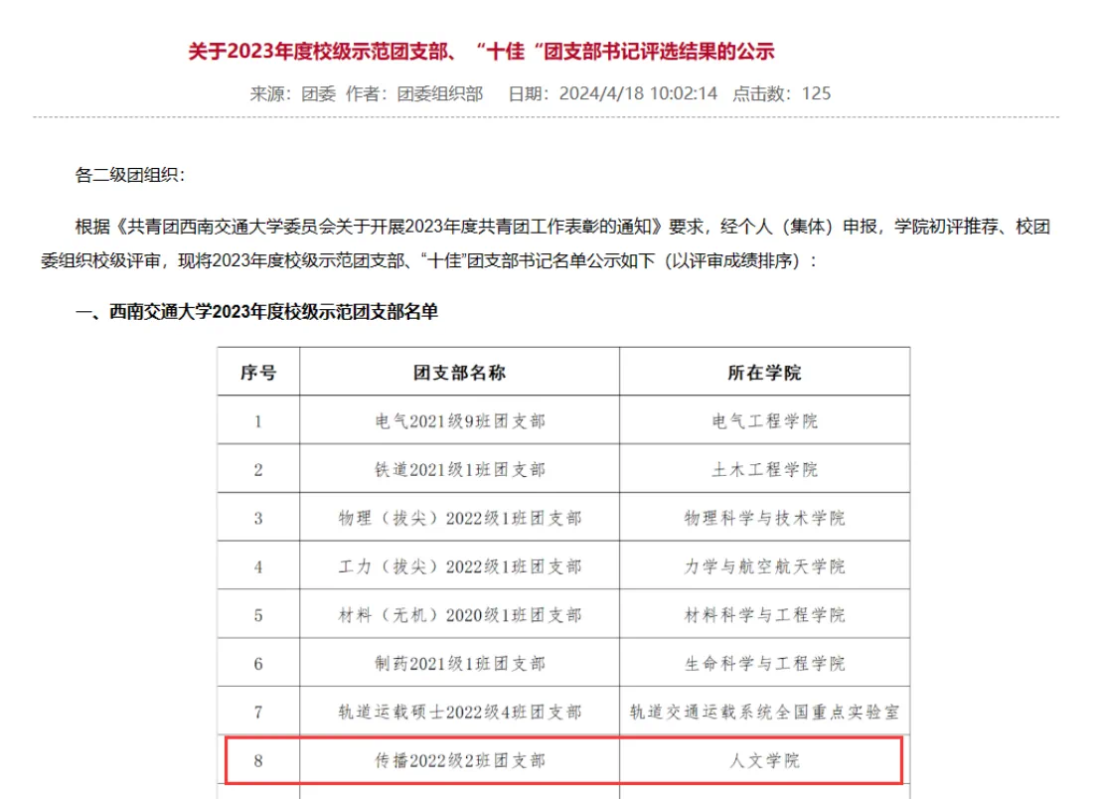 【人文】传播2022级2班团支部获评“校级示范团支部“荣誉称号