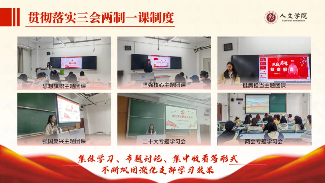 支部现有团员21人,班团委员8人,配合做好支部基础团务工作。支部成员思想上进,积极向党组织靠拢,入党申请书递交率超80%,已推优11人。志愿四川注册率达100%。支部贯彻落实“三会两制一课”制度,按时开展相关会议,支部成员参与率100%,团员信息全部录入智慧团建系统。支部坚持团课制度,按期开展各类主题团课,采取集体学习、专题讨论、集中收看等形式,不断巩固深化支部成员学习效果。
