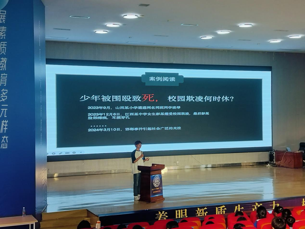 以社会实时热点邯郸事件为例,曲明春同学深情叩问、耐心解答,与学生们亲密交流,深入浅出,让初中生们学会远离和杜绝校园暴力,拥有良好的校园环境。