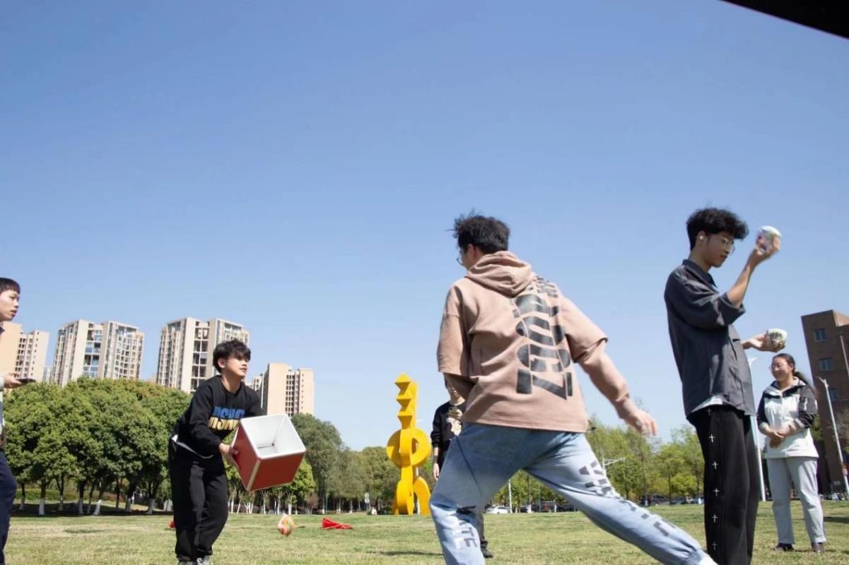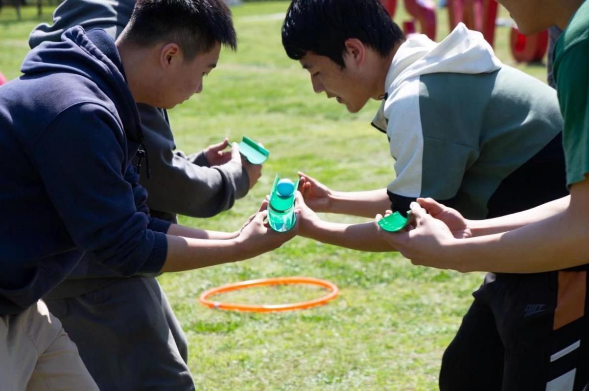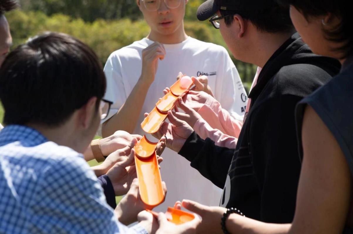 第二个游戏则为“能量传输”,组内所有人员站成一排,每人一根长0.5米的引导槽。赛道长30米,在起点的引导槽放置一个乒乓球,参与队员使用引导槽将乒乓球传递给下一位队员,最后一位队员将乒乓球传递到水杯即算成功。在第一个游戏的铺垫下,第二个游戏过程中同学间的团队合作能力明显有所提升,大家也进一步享受了由游戏所带来的乐趣。