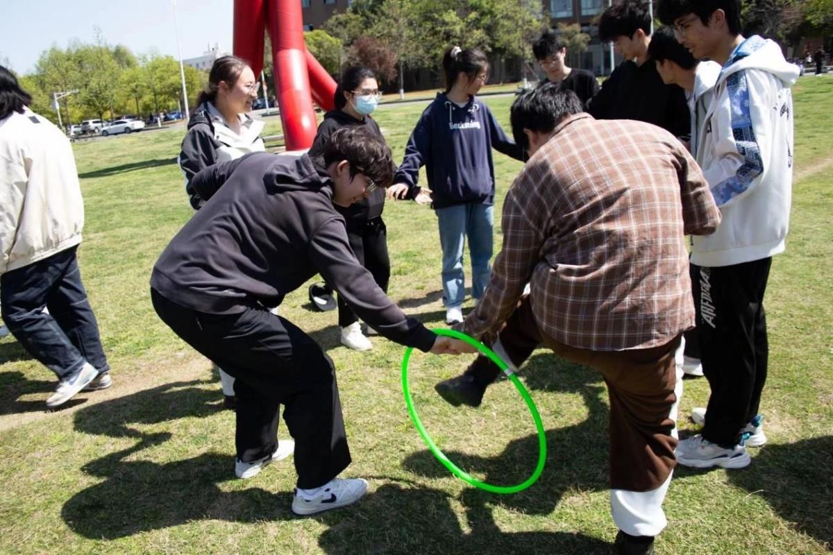 在“一圈到底”游戏环节中,每组站成一个面向圆心的手拉手的圆,发放一个呼啦圈,并将其放置在起点人员的手臂,在相应的规则下将呼啦圈传递一圈回到起点。该游戏使得同学之间得到了互相了解和熟悉。大家不仅在游戏中收获了乐趣,也磨砺了彼此之间的默契。