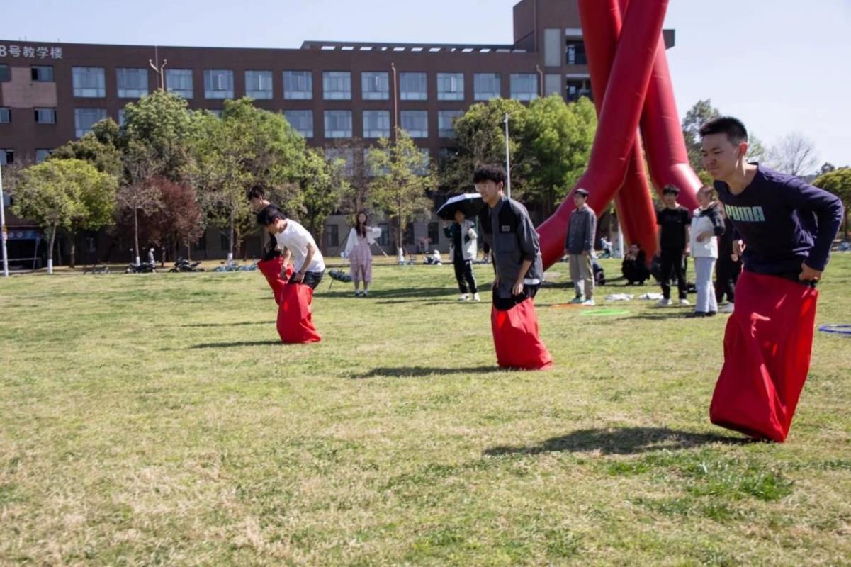 第三、第四个游戏则分别为“袋鼠也疯狂”和“暗中衔接”,一个需要比赛人员套袋跳接力,另一个队员在起始者50米外等待接力,共八人接力,用时短的队伍获胜;另一个则需要三人配合,一人背对投球,一人接球,另一个人捡球,一分钟内接球多的队伍获胜。在前两轮游戏各个队伍成员之间的磨合下,第三、第四个游戏队伍各成员发挥得要更加出色些,人人都在感受欢乐,人人都在衔接快乐。
