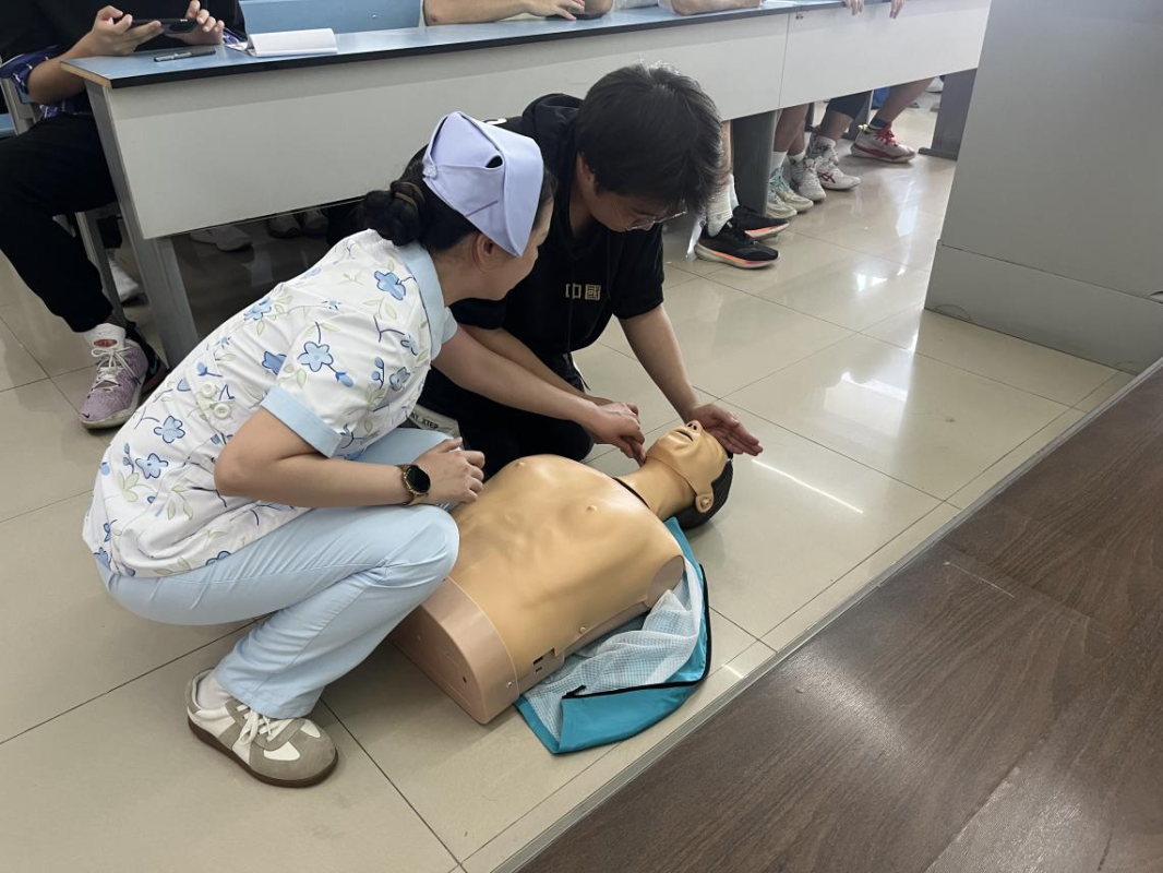 陈慧敏主要向师生们讲授了心肺复苏的相关常识,她借助人体模型为师生演示了关于心肺复苏急救的方式方法,场景充实,讲解详细,引起了同学们的浓厚兴趣,同学们积极参与到急救知识的学习中。在实操演练中,现场学员就心肺复苏涉及的迅速呼救、胸外按压、开放气道、人工呼吸等操作步骤进行分解演练,通过不断“抠细节”“抠动作”,不断纠正各环节的姿势、手法,确保动作标准、力度到位。师生以严谨的态度和饱满的热情,仔细观看教学演示,初步掌握了正确的应急救护方法。