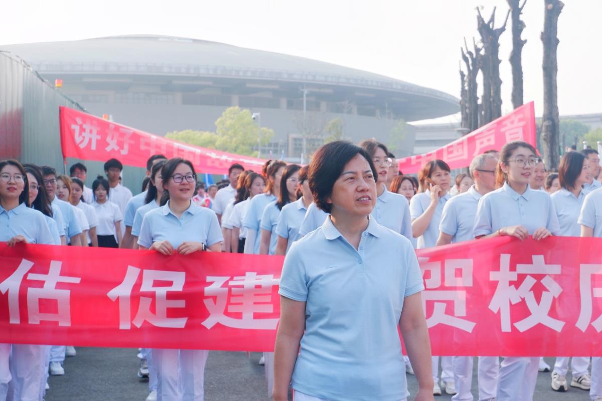 彩旗飘飘,色彩斑斓,每一面旗帜代表着外国语学院的各系,共同展现着多彩外语的魅力。外语人的方阵,坚定而有力,整齐的步伐彰显着他们的团结与协作。身着蓝白衣的他们,手持“教育强国,青年有为;汇通中外,外语有为”的字牌,彰显了外语人致力于中外文化交流、推动教育强国战略的决心与担当。