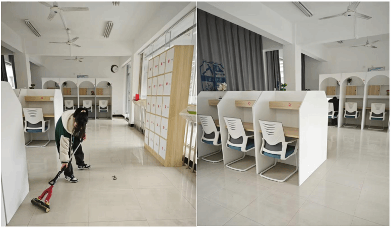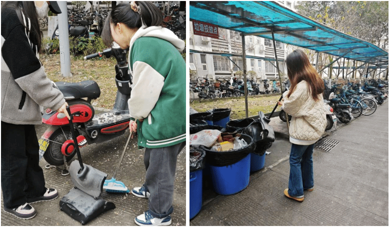 在清扫过程中,同学们不畏惧脏乱的环境,以饱满的热情投入到清扫工作中,以实际行动诠释着青年学生的责任和担当。负责自习室清洁的同学将桌椅板凳摆放得井然有序、整洁美观。同时,负责园区清洁的同学们也将车棚内的自行车摆放得整齐划一。在确认所有区域清洁完毕后,同学们将所清理出的垃圾全部带走,从而确保环境始终保持干净整洁。
