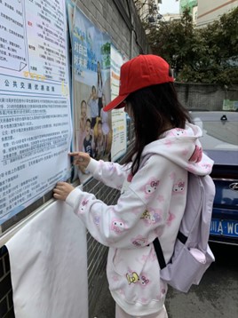 与此同时,另一组志愿者则深入社区,张贴海报,向社区居民普及成都公共交通的优惠政策。