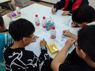 图三 轨道交通小课堂上志愿者们与小朋友一起绘制生活轨迹路线图