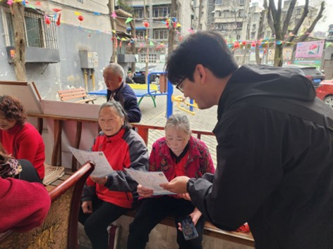 图七 志愿者在社区中给居民讲解成都公共交通优惠政策