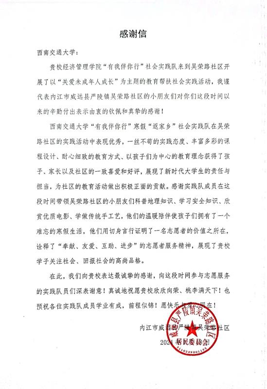 社会实践活动已圆满落下帷幕,但经管学子参与志愿服务、为社会贡献力量的脚步却从未停歇。通过本次社会实践活动,孩子们在丰富的课程中拓宽了课余知识,培养锻炼了动手实践能力,收获了安全、愉快、充实的假期生活;实践队队员们也通过课程活动拉近了与孩子们的距离,真正做到了暖心陪伴,以青春力量赋能乡村振兴。活动结束后,实践团队收到了来自吴荣路社区的感谢信。