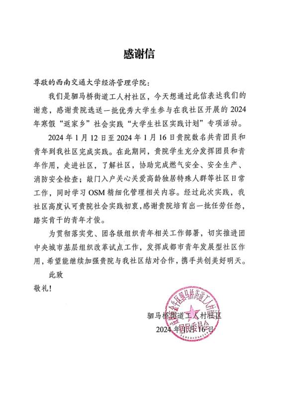 实践队获得了来自驷马桥街道工人村社区的感谢信。