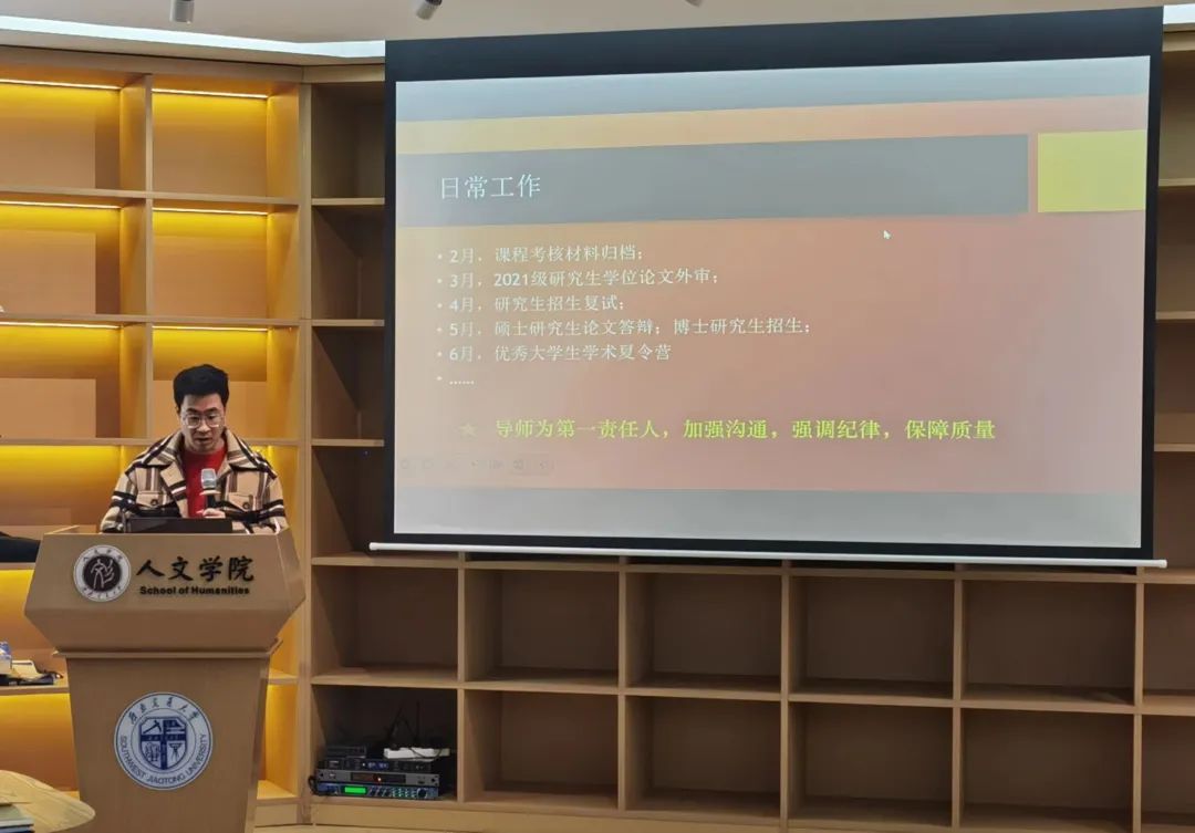 随后,党委副书记郭立昌从“重点关注”“就业工作”“学生活动”“日常管理”四部分对学院新学期学生工作进行介绍。他指出,人才培养是一个系统工程,需要全院上下齐心协力。任课教师、班导师、研究生导师应当多关注学生的学业问题、生活困难、心理困扰,对于学生们成长成才给予充分关注并及时提供帮助。