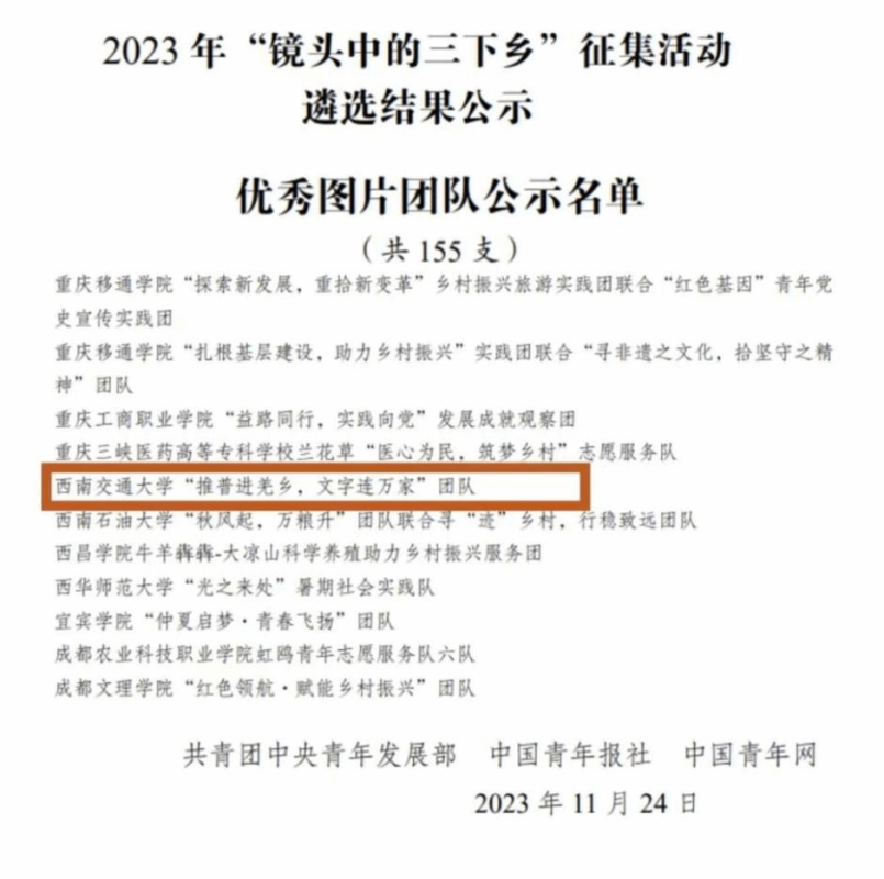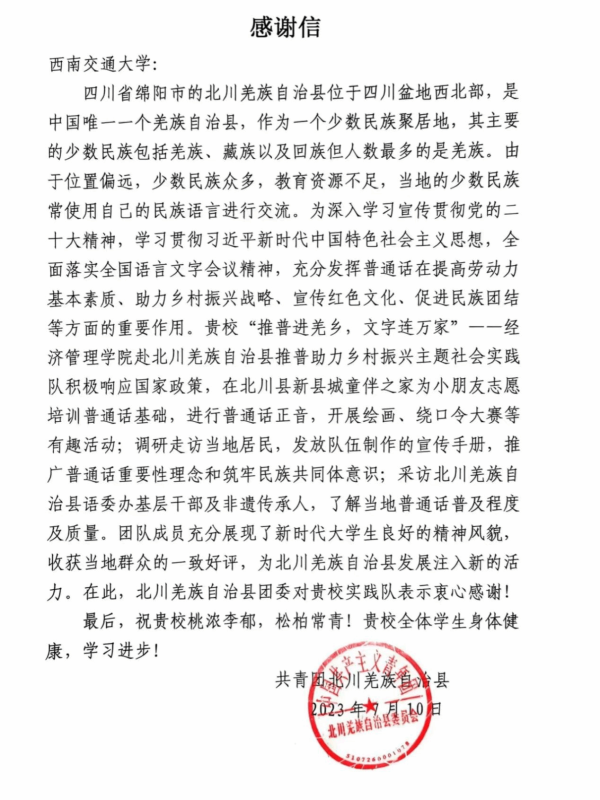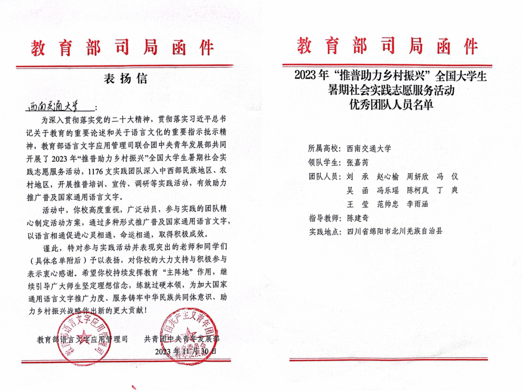 【经管】经济管理学院“推普进羌乡,文字连万家”推普助力乡村振兴2023年暑期“三下乡”社会实践队获教育部表扬