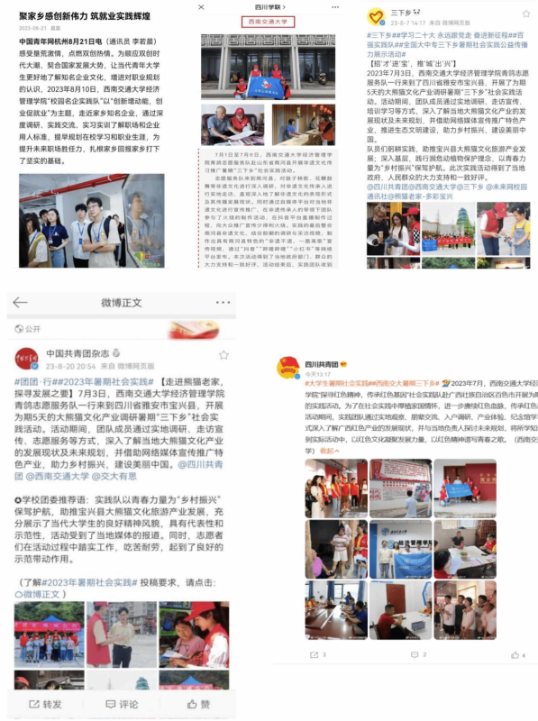 2023年,学院团委分别组织开展了以“学习二十大 永远跟党走 奋进新征程”为主题的寒假“返家乡”社会实践活动、以“强国有我、青春有为”为主题的暑期“三下乡”社会实践活动,引领大家参与志愿服务、投身社会实践并取得了丰硕的成果。经济管理学院两支大学生暑期“三下乡”团队入选2023年全国大学生暑期社会实践优秀团队,6支队伍获评寒、暑假校级社会实践优秀队伍,19名同学获优秀实践队员,4名老师获学校共青团实践育人优秀指导教师,收到实践地反馈信、感谢信共计20余份。实践队伍获中青校园、中国大学生网、今日头条、中国共青团官方杂志、“三下乡”官方微博等国家级媒体报道27篇,四川法制报、四川学联、四川共青团官方微博等省级媒体报道7篇,以及县、市级等其它报道总计77篇。同时,总结、表彰、宣传,树立典型,强化我院实践育人成效,先后发布我院实践队伍风采展新闻及推送6篇,展现了交大经管学子的良好风貌。