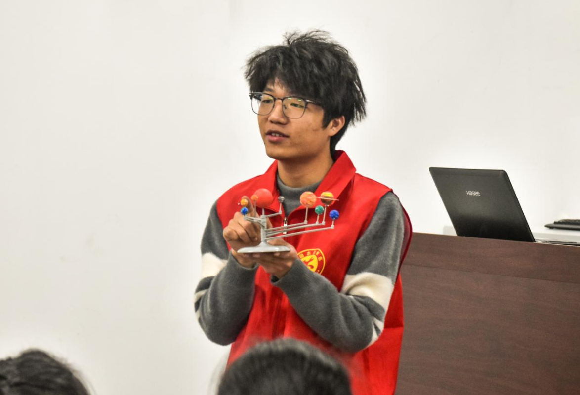 活动伊始,志愿者们精心制作的太阳系模型就引起了小朋友们的注意,就读于应用物理学专业的李嘉睦老师生动地讲解各个行星的外形、特征、内部结构。以往抬头遥不可及的星星,此刻正真实地呈现在小朋友们的眼前,小朋友们聚精会神,听得格外认真。