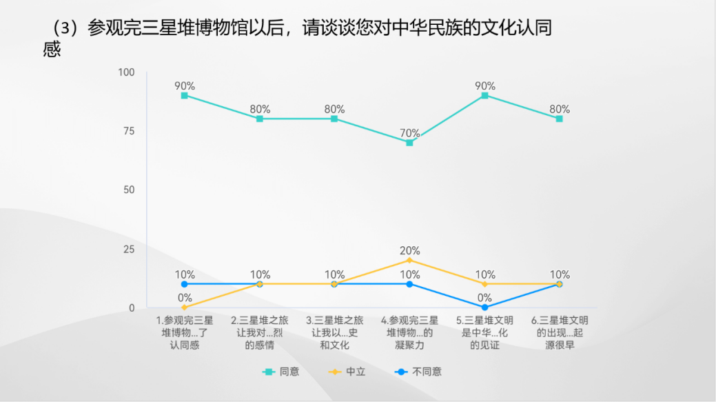 为了解青年学生对三星堆文化以及文物保护研究工作的认识情况,队员们在参观博物馆后组织了问卷调查和现场访谈。调研结果表明:90%的同学都看过三星堆遗址相关的宣传视频、文章等,并希望来到三星堆博物馆切身体验三星堆文化;交通不便是影响游客前往三星堆博物馆参观的主要限制因素。
