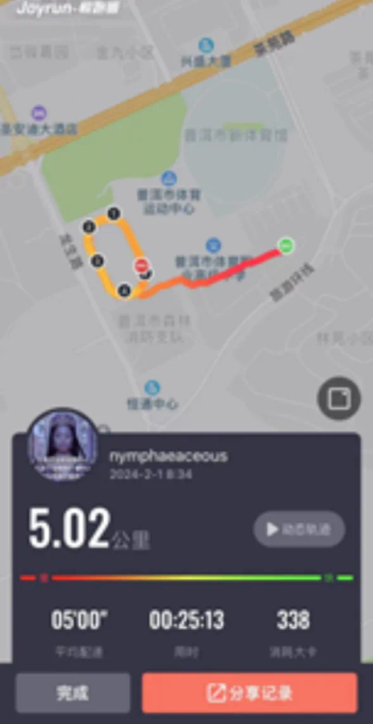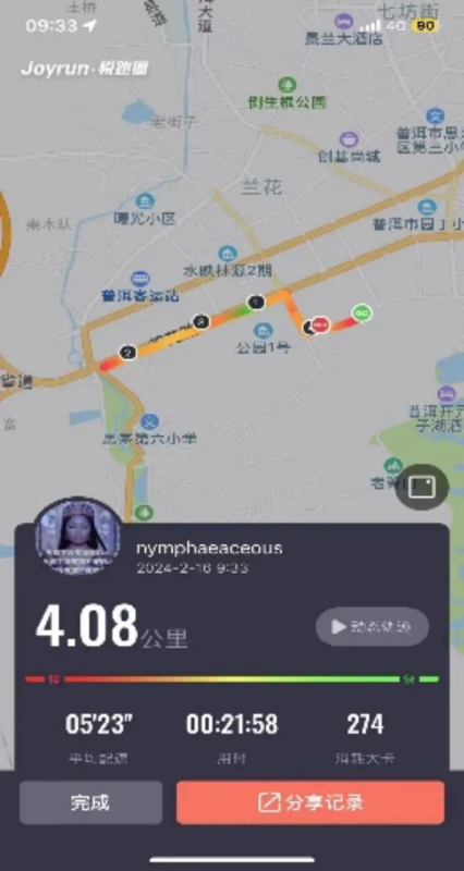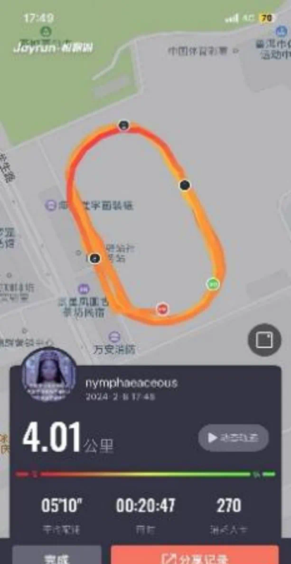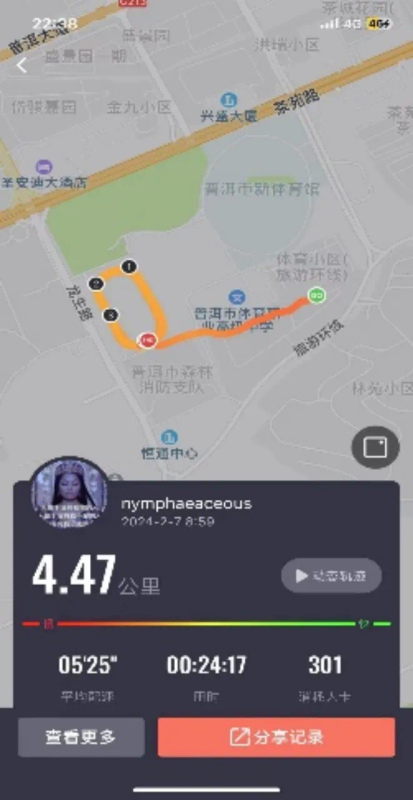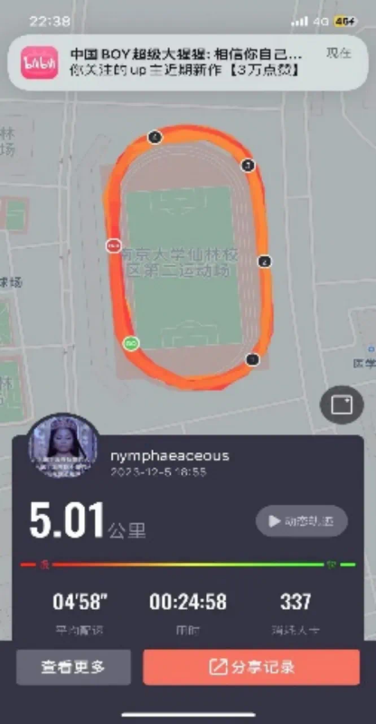 2022级李垠同学在假期也依旧坚持每日锻炼,一圈又一圈的运动轨迹 体现着他不曾松懈的锻炼日常。